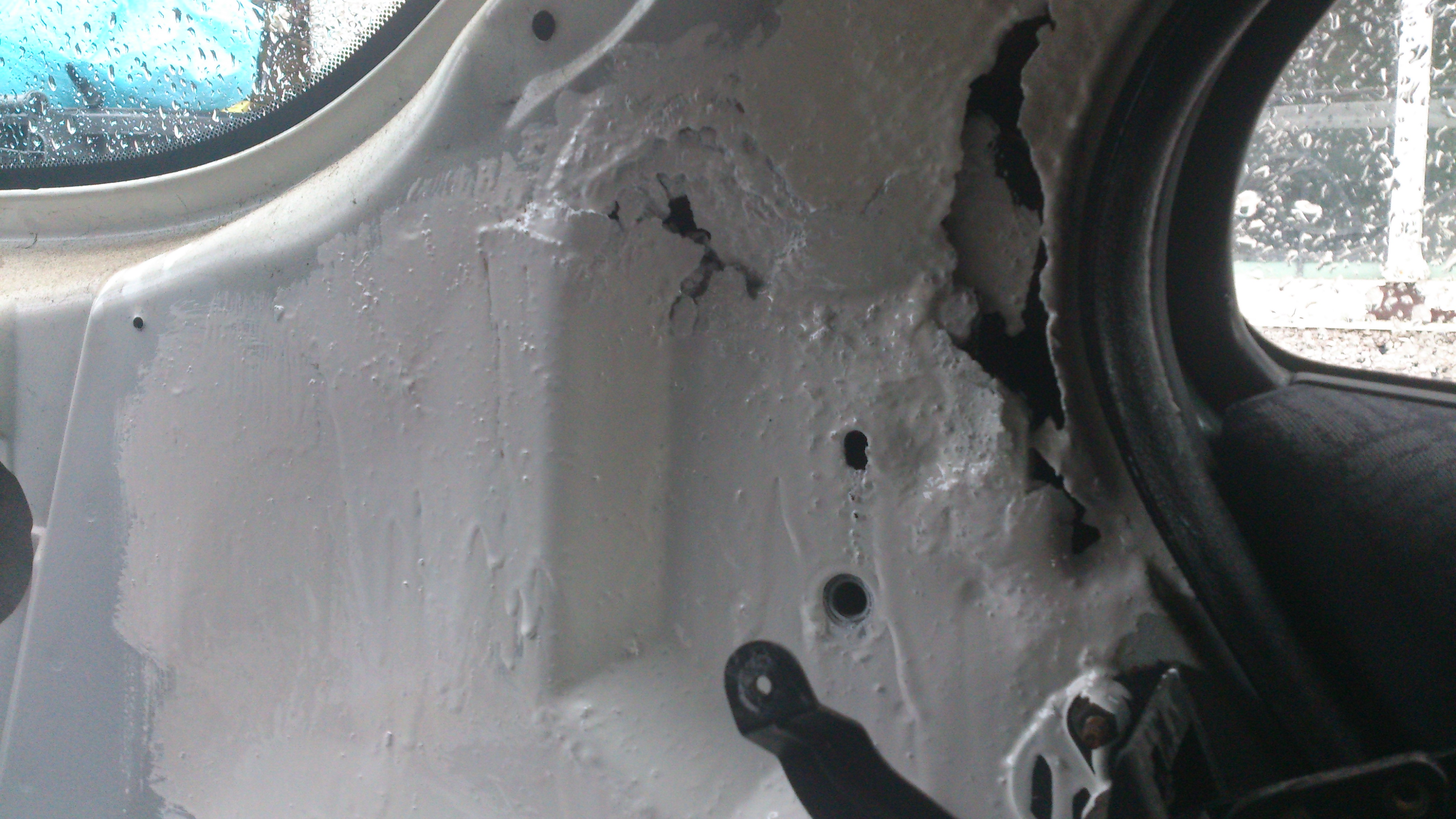 Just been replacing bits of trim which were missing from the estate I bought from Bengley (Birk's old car) and have discovered an alarming amount of rust around the seatbelt mounts in the back. I have just plastered in in hammerite as a temp solution but it WILL fail the next MOT like this.