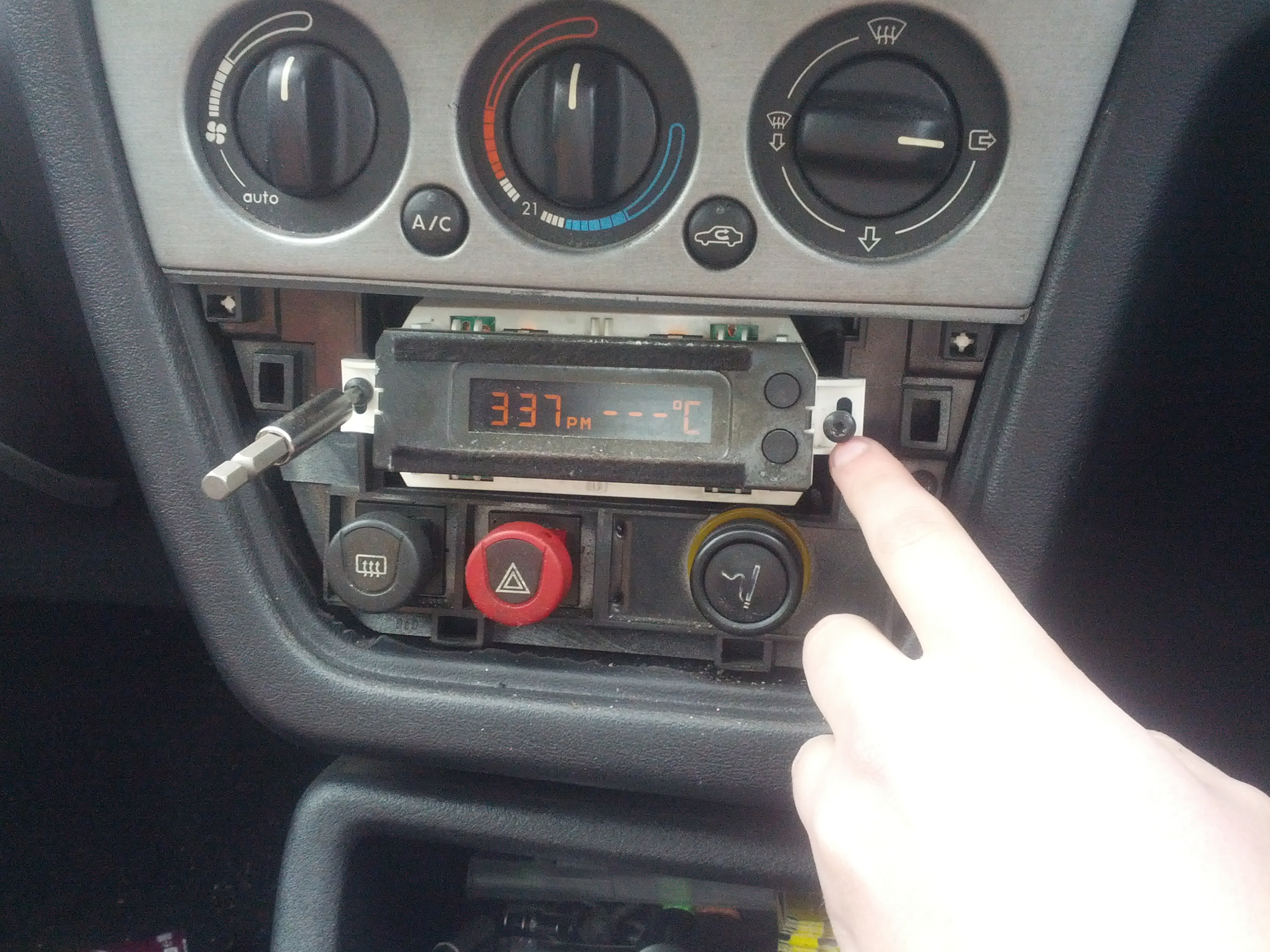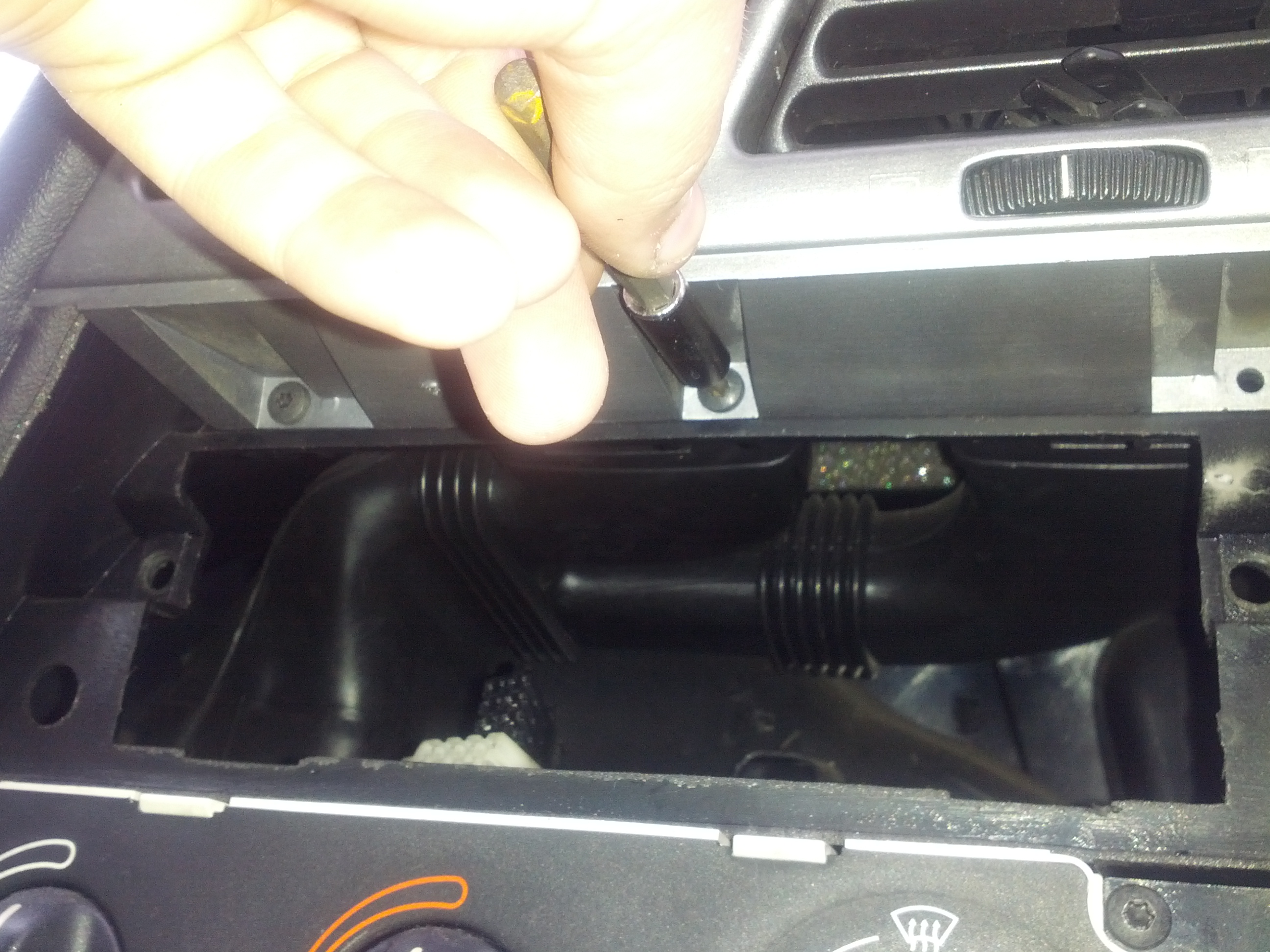 next off, if you have the origional HU then use the reccomended way of getting it out or if you have an aftermarket HU like me then prize the trim out then pull the HU out making sure not to pull on the wires too much or damage the HU