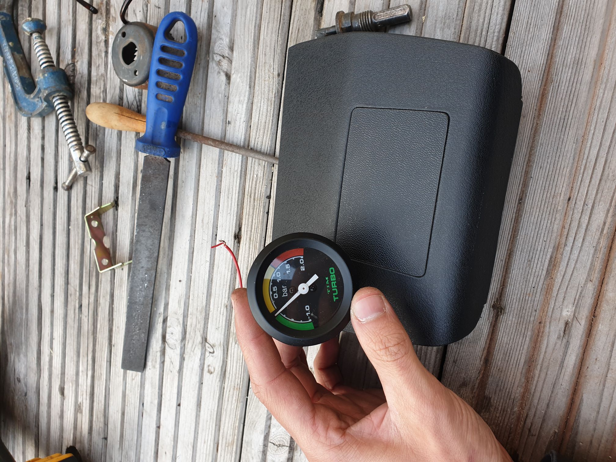 I think this gauge looks great in the car. When tested the car is running .8bar (around 11.5PSI) which IIRC is healthy for a standard Dturbo engine. Unfortunately the second hand gauge is sticky on the way back down to zero, and rattles like mad! It functions and will do for now but a replacement will be needed at some point. A manual boost controller is also on it's way!