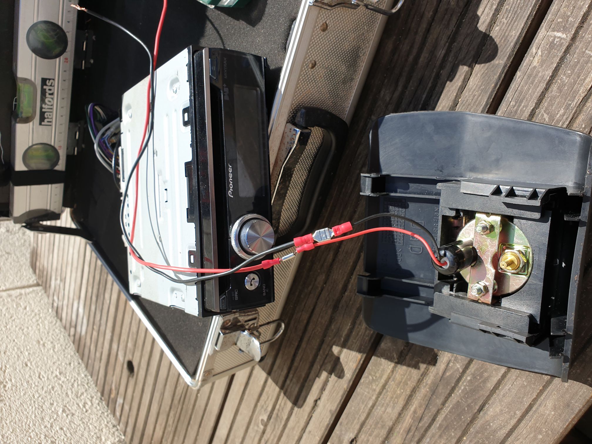 I spliced into the wires coming from the back of the stereo to make sure the display on the gauge only lit up when the headlights are switched on.