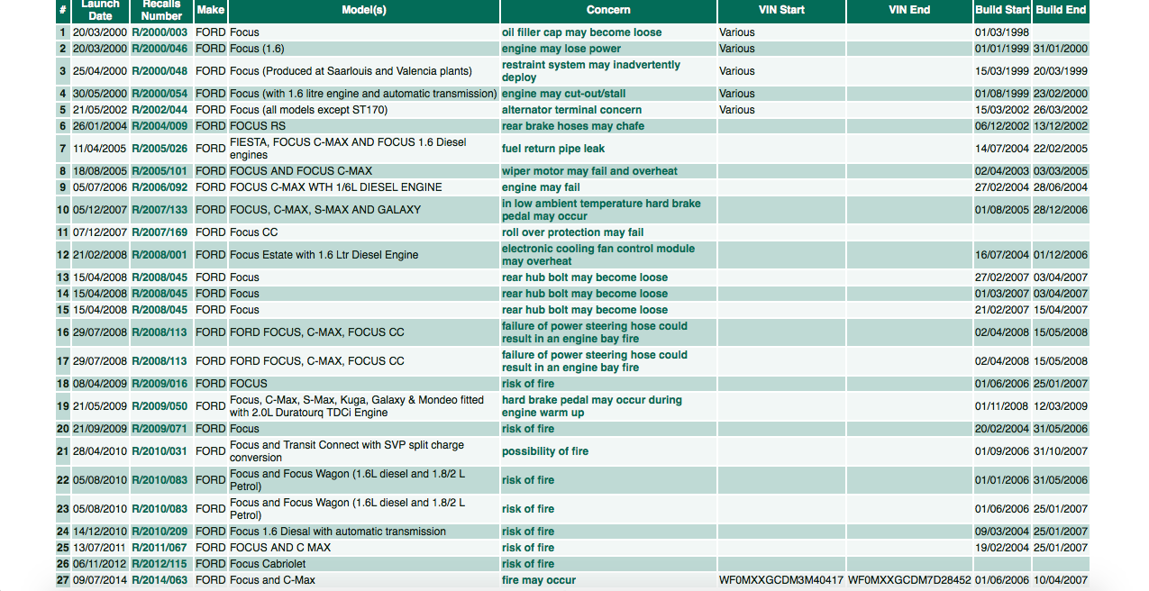 And just because i know Tom will come along and slag everything except for what he owns off, heres the recall log for the focus Wink